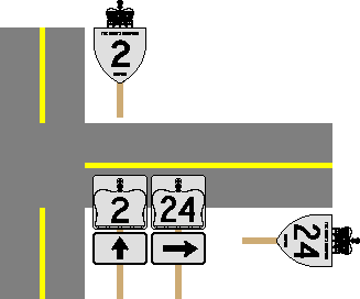 It's interesting to note that the province's application of signage is almost identical to that employed by many U.S. states in the 1950s...which posted ornate cutout signs as trailblazers and plainer square signs with white edges at junctions, much like Ontario today: