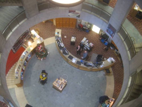 The Lillian H. Smith branch is located in between U of T and Chinatown, and opened in 1995. It's a very aesthetically-appealing structure: Each level is wrapped around a cylindrical atrium and linked by a spiral staircase. This also wasn't the first time I had visited: I had stepped into this library on a whim last December, when I was wandering the city waiting for an evening train and had hours to burn. (The two pictures above were actually taken during that prior visit, since the shadows and crowds were more coöperative that day.)