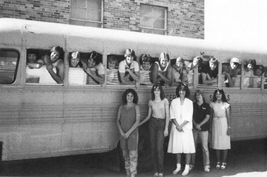 #258, a 1971 Blue Bird/International bus, appeared as a dusty background element in this 1981 yearbook photo. The county began adding front-facing fleet numbers to its buses at some point in the intervening decade, visible under the driver's-side headlight. [Bramwell High School yearbook, 1981]