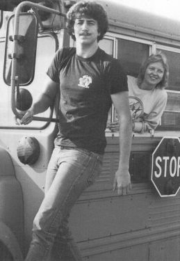 #285, a 1974 Carpenter/Ford, was likely tied as the last Ford-chassis bus ever acquired by the district. Most of Mercer County's Carpenter buses from this era were equipped with outward-opening doors with equally-sized leaves. [Montcalm High School yearbook, 1980]