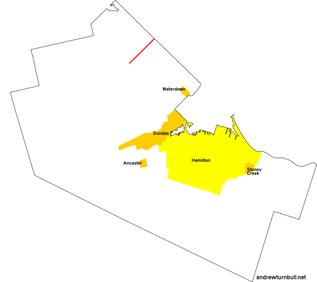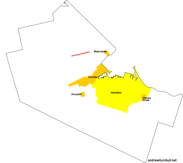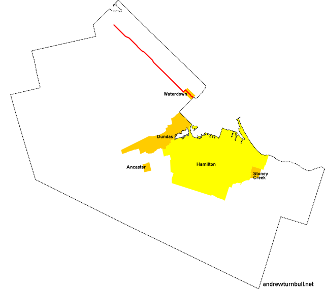 | (Shown above in pink.) | Parkside Dr. | Hamilton St., Waterdown | Halton Region line east of Waterdown | 3 |