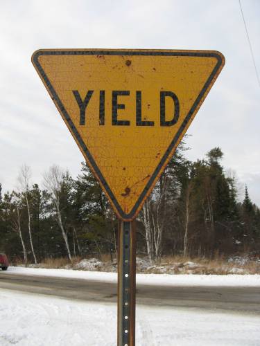 Every time I travel in northern Ontario, I find myself keeping my eyes open for flat-topped 3s, straight-lined 1s, and obsolete designs of any stripe. This yield sign in Ignace might be my best find yet...and it has got to be about 50 years old.